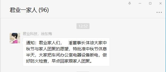 2021??1日(农历八月十五)中午,为庆祝中秋佳节,让公司员工在这个团圆的日子里感受到温馨和美好?a href="http://0832sw.com/" target="_blank">河北君业科技股份有限公司综合办公室按照董事长潘存业、总经理杨智丽的指示为君业的家人们精心准备午餐,大家欢聚一堂,共庆中秋佳节?