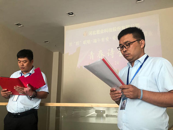 2020??4日上午,适逢端午佳节前夕,为弘扬中华传统文化,提高君业人爱国主义思想,增强员工们对祖国、对家乡、对君业的热爱之情,提高君业人的文化素养,丰富员工的精神文化生活?a href="http://0832sw.com/" target="_blank">河北君业科技股份有限公司億彩董事长潘存业、总经理杨智丽对员工殷切关怀,部署开展端午节特别纪念活动。为此,河北君业科技股份有限公司组织开展了“放‘粽’歌唱,端午有爱,爱我中华,爱我君业”青春诗会活动,活动分为公司总部(临港区)和总部基地(丰南城区),两地同时进行,全体员工参加,青春诗会后,全员两地共进午餐,欢度端午节?